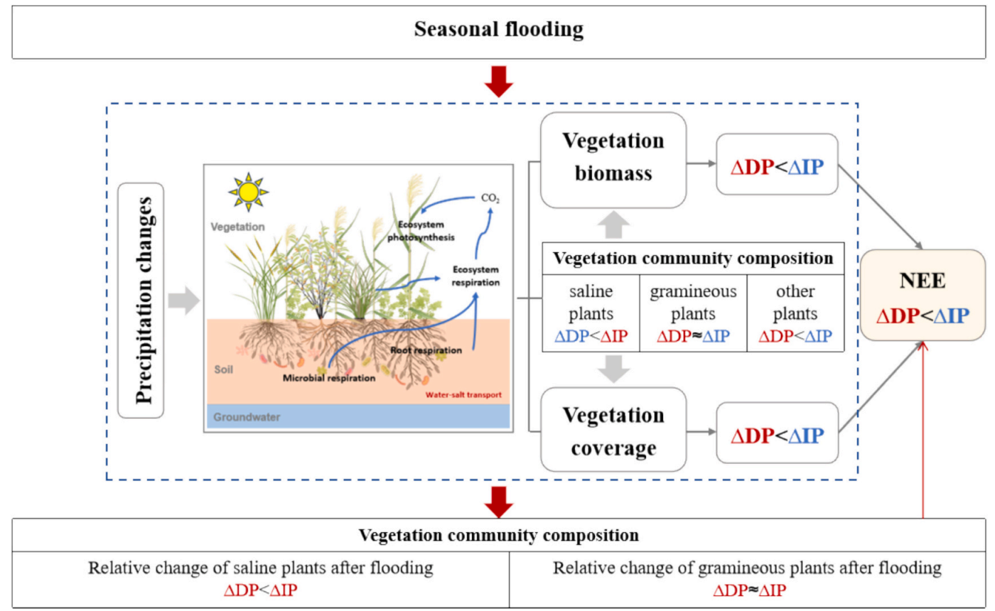 Figure 1. Conceptual diagram illustrating how precipitation change and seasonal flooding regulate net ecosystem CO₂ exchange (NEE) in a saline wetland. DP indicates decreased precipitation, and IP indicates increased precipitation; red arrows represent inhibitory effects, whereas blue arrows represent promotive effects.
