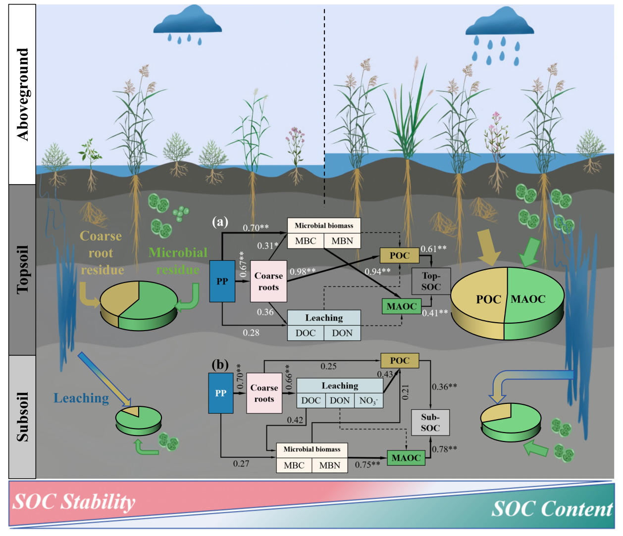 Another study systematically investigated how altered precipitation regulates SOC content and stability through differential responses of coarse and fine roots. The results showed that increased precipitation significantly promoted the dominance of gramineous species characterized by coarse-root systems, thereby markedly increasing coarse root biomass, whereas fine root biomass exhibited no significant variation among precipitation treatments. Compared with the control (CK), the increase in coarse roots directly enhanced particulate organic carbon (POC) accumulation in the topsoil (0-10 cm) by 37.4%, and indirectly increased mineral-associated organic carbon (MAOC) by 31.5% through stimulating microbial biomass carbon (MBC). In addition, the formation of macropores by increased coarse roots significantly facilitated the downward leaching of dissolved organic carbon (DOC) and nitrate (NO₃-), thereby promoting POC (+218.7%) and MAOC (+17.2%) accumulation in the subsoil (30-40 cm).